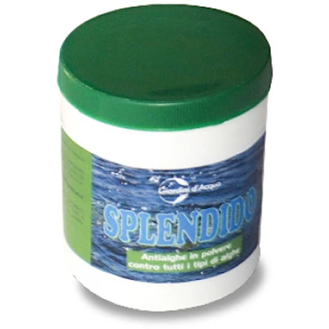 Mini barattolo di Splendido Antialghe in polvere. Un prodotto naturale contro tutti i tipi di alghe. Prodotto consigliato da Laghettopoint.it. La nuova confezione da 200 grammi sufficiente per una dose da 5.000 litri d’acqua del vostro laghetto!