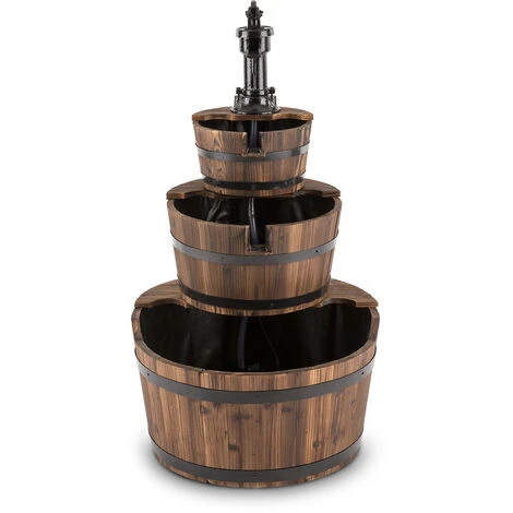 Un piacevole gorgoglio d’acqua associato ad un aspetto intrigante, questo caratterizza la fontana da giardino Cascada 2G di Blumfeldt. Con i suoi mastelli in legno da cui sgorga acqua in circolo chiuso, la fontana a cascata dona un tocco rustico in ogni giardino o terrazza.Tre piani in legno, come al tempo dei nostri nonni, s ‘innalzano in una torre coronata da una decorativa pompa manuale in ghisa laccata di nero. Le tre vasche sono realizzate in cipresso di Cunningham massiccio e trattate a fiamma per dare un effetto invecchiato. In questo modo la fontana restituisce alla perfezione lo stato d’animo dei tempi passati e aiuta a creare un’atmosfera di tranquillità. Per far sì che l’acqua rimanga nei contenitori e che il legno non imputridisca, le tinozze sono ricoperte all’interno da uno strato protettivo.Naturalmente non dovete avere paura di dover mettere mano alla pompa per far scorrere l’acqua. A questo ci pensa la pompa elettrica integrata posizionata nella vasca inferiore che grazie ad un sistema di tubi porta l’acqua fino allo sbocco della pompa manuale. Con una potenza di 12W e una capacità di flusso di 800 litri in un’ora viene assicurato un continuo e potente flusso d’acqua dalla fontana a cascata di Blumfeldt.