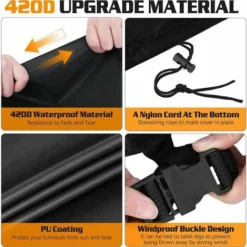 RESISTENZA E PROTEZIONE AI RAGGI UV – Copertura premium per mobili da giardino – Design per tutte le stagioni, protegge da vento, pioggia, gelo, danni UV, sporco, polvere, escrementi di uccelli, ecc. MANTIENI I TUOI MOBILI PULITI E ASCIUTTO – Lo sfiato in tessuto di poliestere premium per la traspirazione, che previene l’accumulo di umidità e mantiene i tuoi mobili puliti e asciutti. MATERIALE DUREVOLE – Realizzato in robusto tessuto Oxford in grado di resistere agli agenti atmosferici, all’acqua e agli strappi. Le robuste cuciture ad incastro aggiungono resistenza e durata.RESISTENZA AL VENTO – Il comodo orlo con coulisse e le cinghie con fibbia mantengono la copertura sicura proteggendo il tavolo e le sedie nei giorni più ventosi.FACILE DA PULIRE – Questa grande copertura per mobili può essere pulita con panni umidi o lavata in lavatrice.