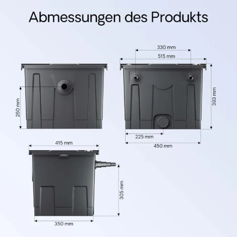 Con un volume di circa 60 litri, il filtro per laghetti assicura una pulizia affidabile dei laghetti koi più piccoli con il minimo sforzo. È dotato di un totale di 2 spugne filtranti grossolane, 2 spugne filtranti fini e 1 tappeto filtrante giapponese.