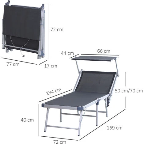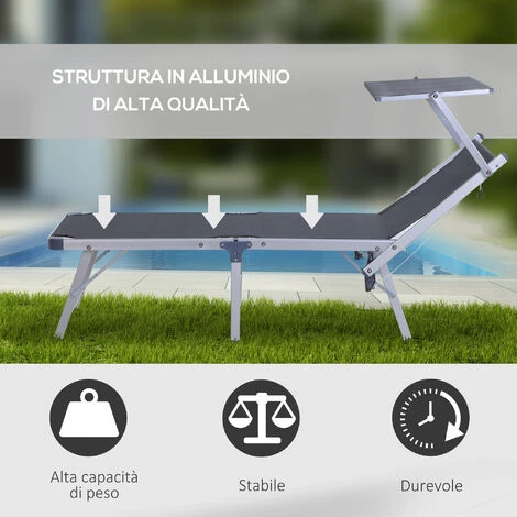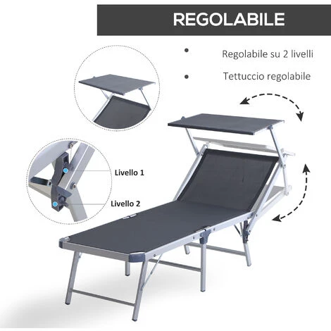 Questa sdraio da esterno Outsunny è la soluzione perfetta per rilassarti sotto al sole. Ti offre un comodo spazio per sdraiarti e un pratico tettuccio regolabile per proteggerti dalla luce del sole. Puoi scegliere il livello di inclinazione della sdraio facilmente con il sistema a corda. Questo sdraio da balcone è salvaspazio, lo puoi piegare e riporre con il minimo ingombro oppure per portarlo con te in macchina. Non rinunciare al comfort, scegli questo pratico lettino da mare!