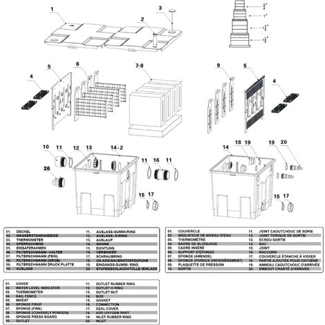Questo è importante se si intende ingrandire il laghetto da giardino o se il filtro a 1 camera non è sufficiente. Tutte le parti necessarie, le connessioni e le spugne filtranti sono incluse. L’estensione è di circa 60 litri. La camera è dotata in totale di 2 spugne filtranti grossolane, 2 spugne filtranti fini e 1 tappeto filtrante giapponese.