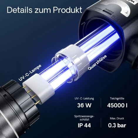 L’acqua del laghetto è aspirata da una pompa e passa per l’alloggiamento, dove scorre fino a una lampada speciale a raggi ultravioletti (UV-C), grazie ai quali tutti i microbi ed i batteri dannosi sono distrutti e la formazione di alghe è ridotta al minimo. In 14 giorni avrete nel vostro laghetto un’acqua limpida e pulita; otterrete un risultato ancora migliore combinando quest’apparecchio ad un filtro biologico.